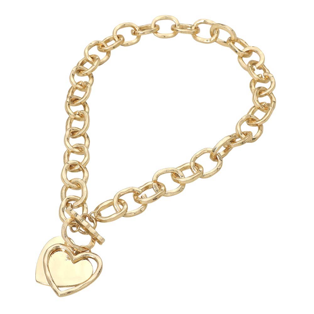 Hammered Layered Heart Pendant Chunky Chain Toggle Necklace