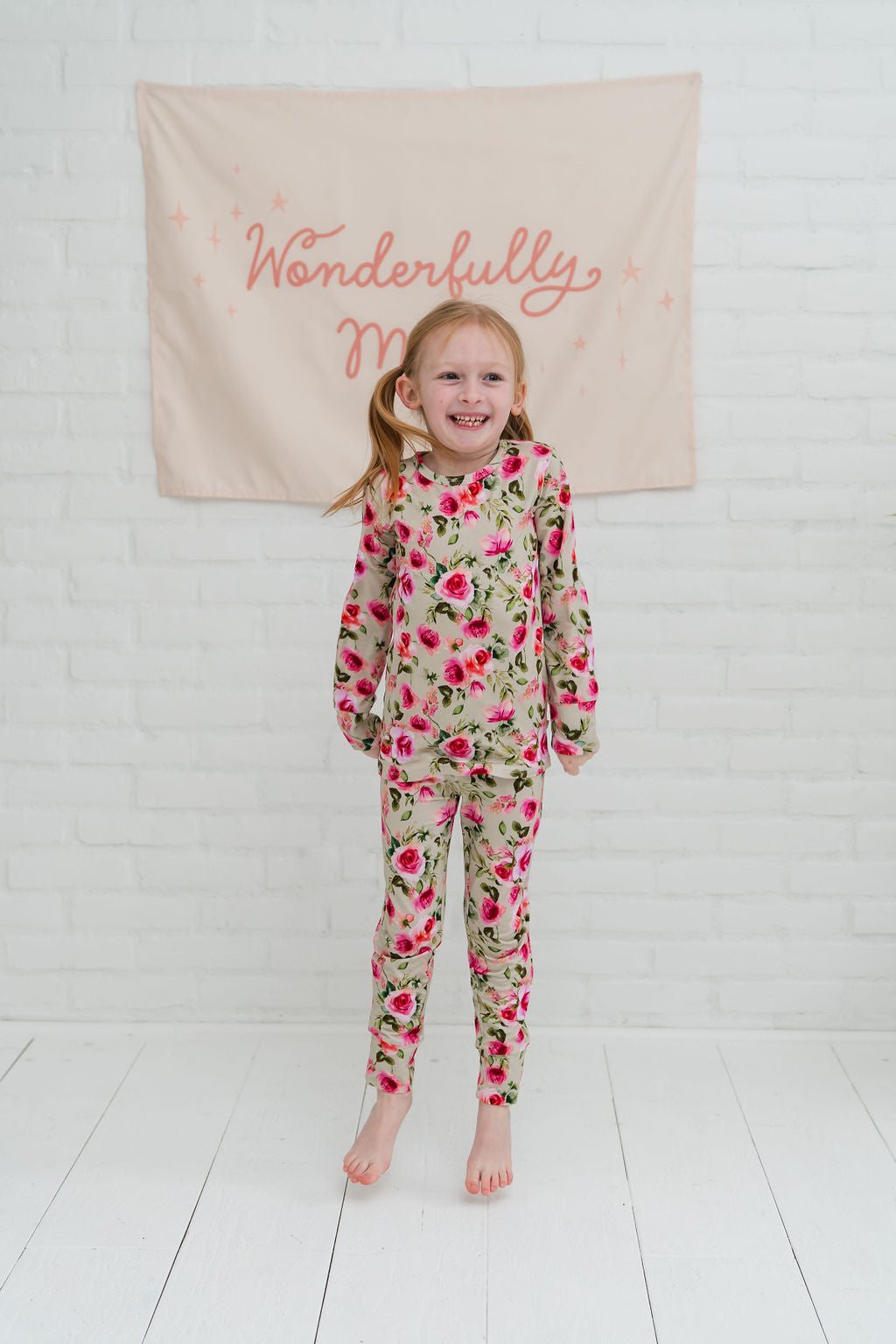 Embrace the versatility of our Lochlyn Convertible Ruffle Zip or 2 Piece Set! Made with stretchy and comfortable bamboo fabric, these pj's are ideal for year-round wear. The beautiful pink floral design on a light sage background and pink ruffle detail add an adorable touch while ensuring functionality for your little girl on the go!