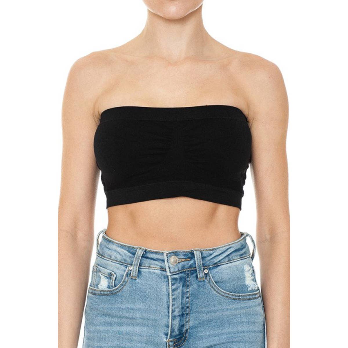A tube top in a seamless knit fabrication featuring bra pad inserts